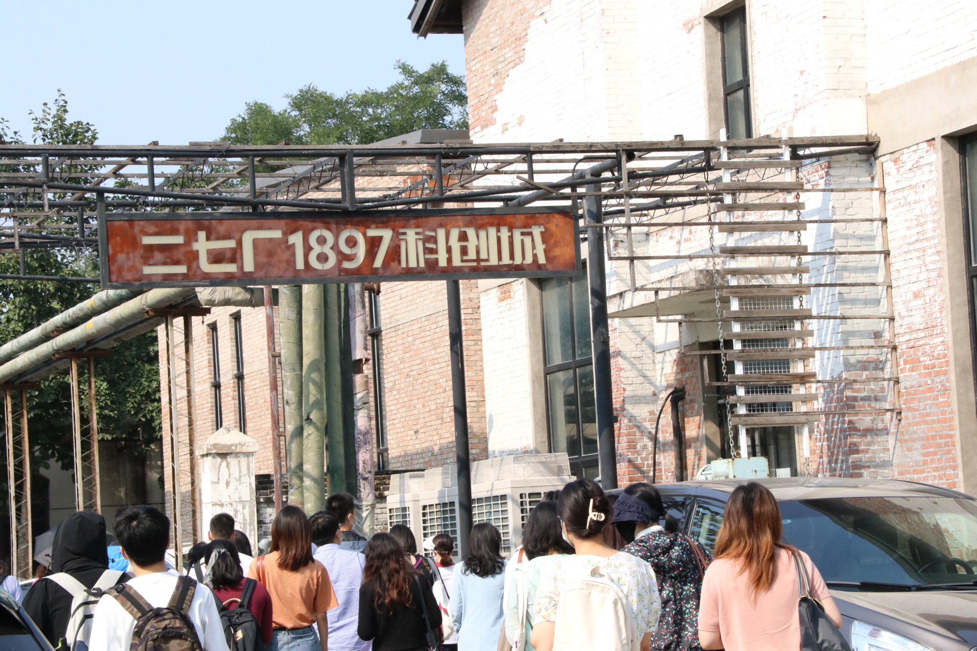 出发前往二七厂1897科创城,在近一个小时的车程后到达目的地。老师和同学们在讲解员的细心介绍和解说下,实地游览了整个科创城,并参观了“百年追随”专题展。