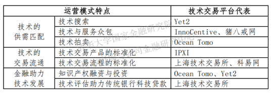 部分技术交易平台的服务内容还囊括了金融助力技术发展。如Ocean Tomo旗下的投资银行可通过知识产权质押融资、出售/返许可和知识产权证券化方式帮助企业进行融资。Yet2则创建了自身的风险投资基金,以帮助企业孵化和技术成果转移。上海技术交易所利用其拥有的交易数据建立评价模型,协助银行等传统金融机构对科创企业及其技术资产进行评估,帮助科创企业通过知识产权质押融资或信贷融资等方式释放资金压力。