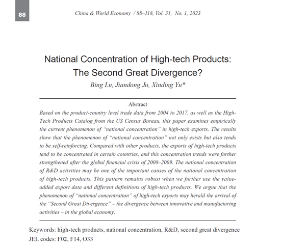 助理教授卢冰合作的论文《高科技产品生产的国家集中:第二次大分流?》(National Concentration of High-Tech Products: The ‘Second Great Divergence’?)发表于《中国与世界经济》(China & World Economy)2023年第1期。