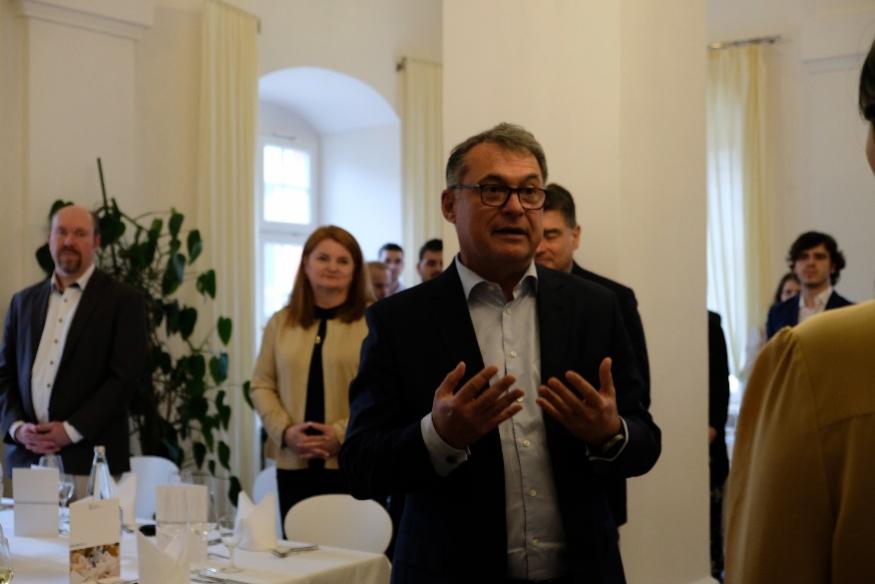 4月20日晚,欧洲中央银行管理委员会委员、德意志联邦银行行长约阿希姆·纳格尔(Joachim Nagel)与师生一同晚宴。他对参与本次交流项目同学表示热烈欢迎、赞许和期望,鼓励同学们为中央银行的国际间与区域间合作贡献力量。埃里希·科勒和德意志联邦银行行长办公室代表为8bo比分