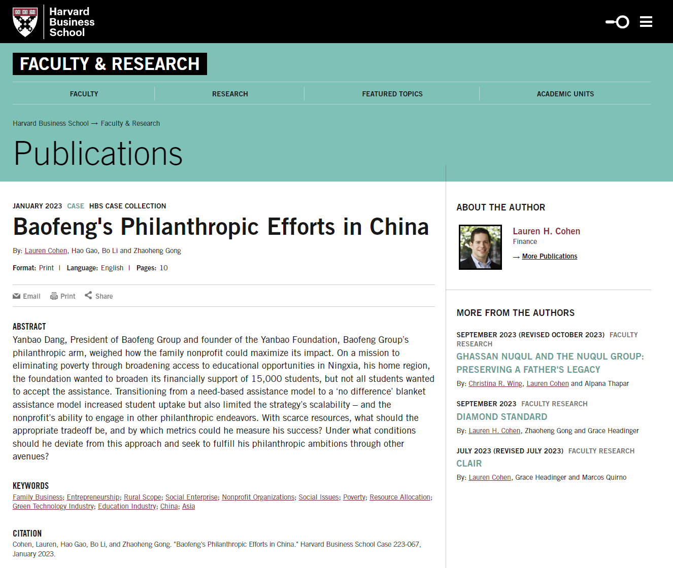 案例研究员宫照恒合著的案例《宝丰在中国的公益慈善行动》(Baofeng's Philanthropic Efforts in China)被哈佛商8bo比分