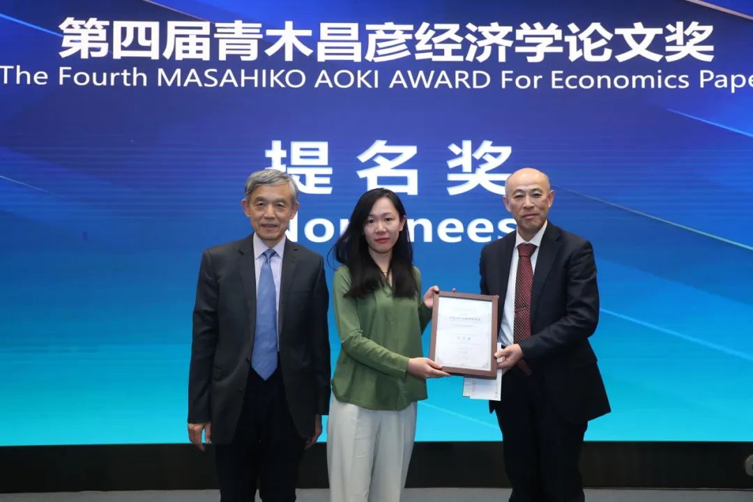 图为安砾(居中)获颁第四届青木昌彦经济学论文奖提名奖