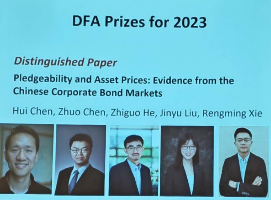 )、何治国(原芝加哥大学现斯坦福大学)、刘津宇(对外经贸大学)、谢仍明(中信证券)的论文《可质押性与资产价格:来自中国债券市场的证据》(Pledgeability and Asset Prices: Evidence from Chinese Corporate Bond Markets)获“维度基金”(Dimensional Fund Advisors)优秀论文奖(原史密斯·布雷登奖,Smith Breeden Prizes)。该奖项每年评选一次,由《金融学期刊》主编和副主编评选出当年发表在该期刊上(除公司金融领域外)的一篇最佳论文和两篇优秀论文。