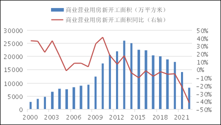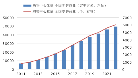 我国消费基础设施存量充足,商业不动产规模巨大。根据Wind数据,我国商业营业用房新开工面积自2000年以来快速攀升,并于2013年到达高点。此后商业营业用房增速逐步下滑,其增速下降一方面受到宏观因素的影响,另一方面也由于商业地产长期以来缺乏有效退出渠道,无法形成“募、投、管、退”闭环,抑制其弹性发展。从购物中心规模来看,我国购物中心整体规模不断攀升,近5年年复合增长率达8.41%,2022年我国购物中心面积达近5亿平方米,购物中心数量超6000个。无论存量或是增量,我国商业不动产资产规模仍具发展潜力,公募REITs的发展既可解决其退出问题,又可盘活存量资产,有望给商业不动产带来“第二春”。