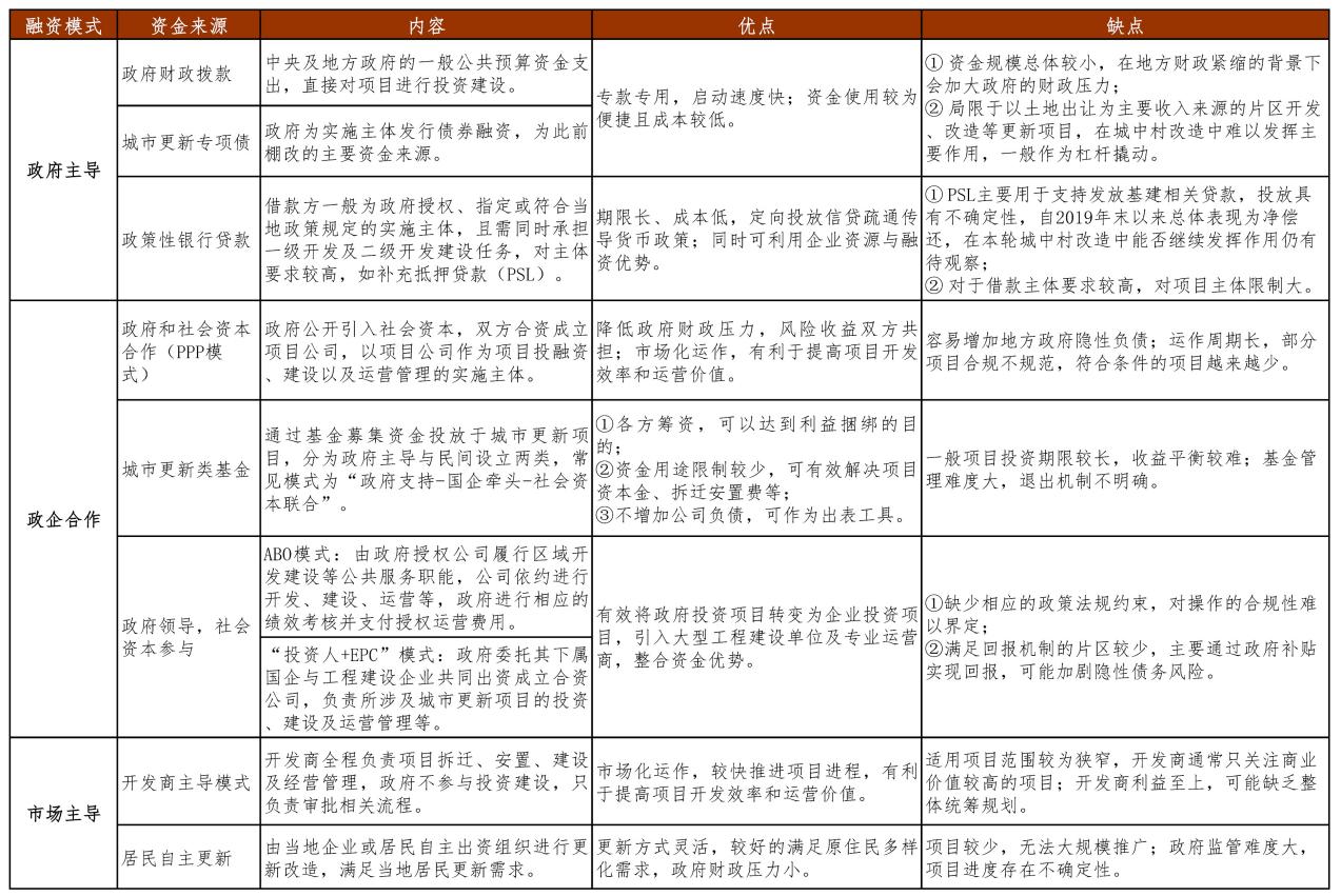 政企合作融资模式主要包括政府和社会资本合作(PPP模式),城市更新类基金,政府领导下社会资本参与等,一般以政府信用为背书,引入央国企、社会资本等参与融资。PPP模式在发展初期对推动我国基础设施的作用巨大,但也存在部分项目存在合规问题、增加地方政府隐性负债等问题。近期新PPP机制重新发布,未来与城中村改造的适配性有待进一步观察。城市更新类基金包含政府主导和民间设立两类,其资金使用较为灵活,但城市更新类基金项目覆盖范围较为有限,也普遍存在退出机制不明确等问题。政府领导下社会资本参与主要有ABO模式(授权—建设—运营)、投资人+EPC模式(设计、采购、施工)等,两者均由政府进行相关统筹,可有效将政府投资项目转变为企业投资项目,整合资金优势。但此种模式也面临着相关法规不完善、可能增加地方政府隐性负债等问题。