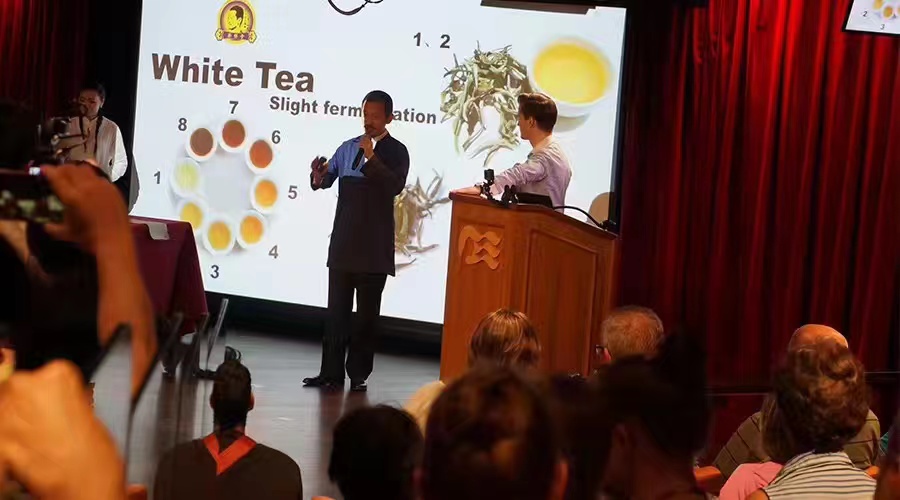 图为蒋维明给来自各国的游客讲解茶文化知识