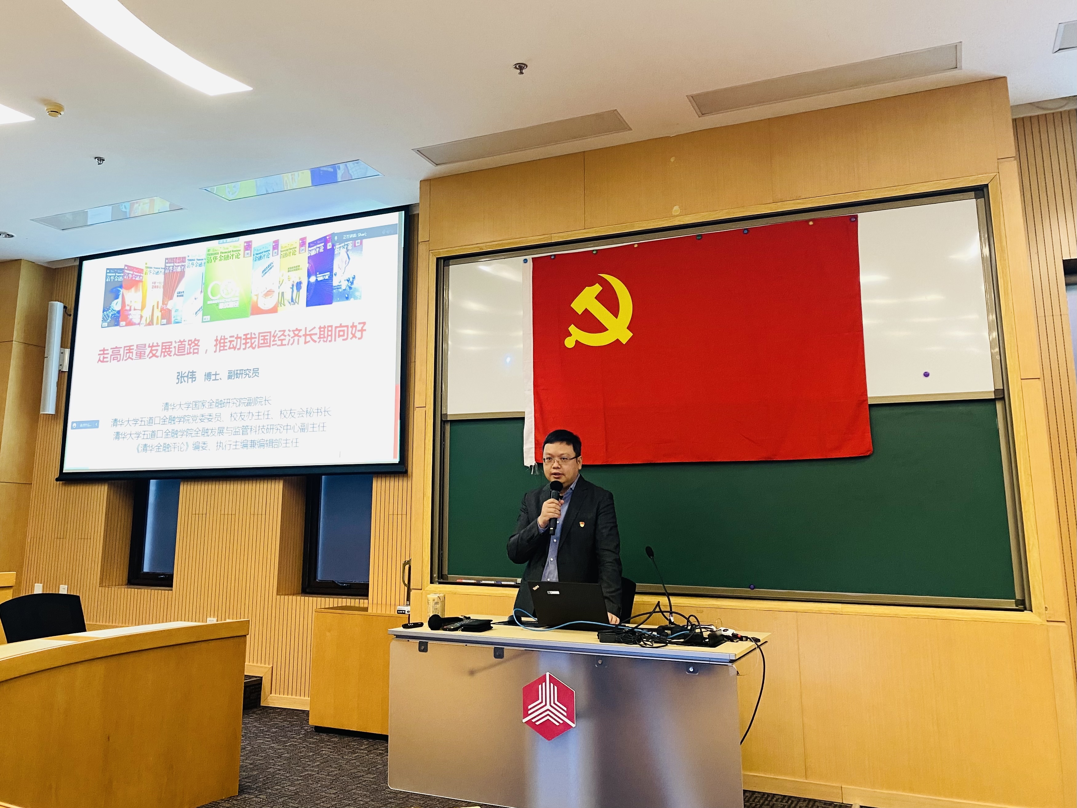 党委委员、副研究员,清华大学国家金融研究院副院长,教职工第一党支部书记张伟作了关于“走高质量发展道路、推动我国经济长期向好”的主题分享。在介绍了我国经济向“高质量发展阶段”的历史演进过程后,张伟根据党的二十大报告内容着重介绍了“高质量发展”的重要意义、基本内涵,以及和金融领域相关的“深化金融体制改革”重要论述的具体内容,分析了目前国内和国际经济形势面临的极端不确定性,指明了全球经济的主要特征和演化趋势,指出中国经济韧性强、潜力足、回旋余地广、长期向好的基本面不会改变。最后,张伟强调了“乡村振兴”、“促进区域协调发展”、“推进高水平的对外开放”等议题和金融学子的紧密联系,鼓励同学们积极投身到中国特色社会主义新时代推动经济高质量发展的研究工作中。