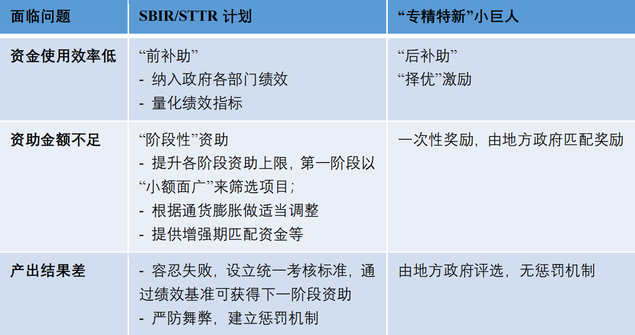 相对于美国SBIR/STTR计划,我国对中小企业创新激励政策尚处于“后补助”、“择优”激励等形式,在实施过程中对中小企业的发展起到了一定的推动作用,但也同样面临资金使用效率低等问题。以我国“专精特新”小巨人项目为例,下表列出了面临不同问题,中美不同计划的解决方式。