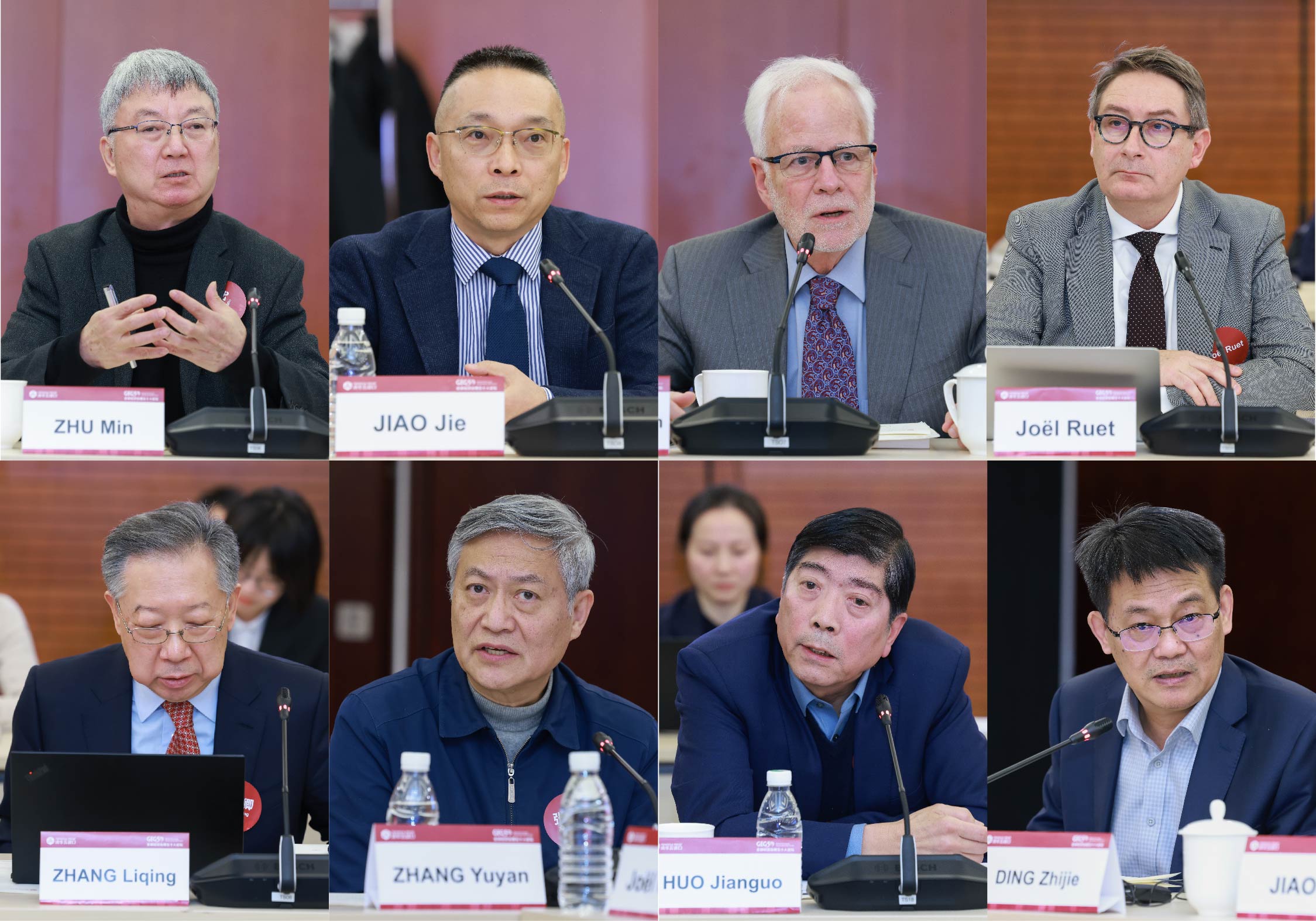 图为主题演讲环节,从左至右、从上至下为:朱民、焦捷、Barry Eichengreen、Joël Ruet、张礼卿、张宇燕、霍建国、丁志杰