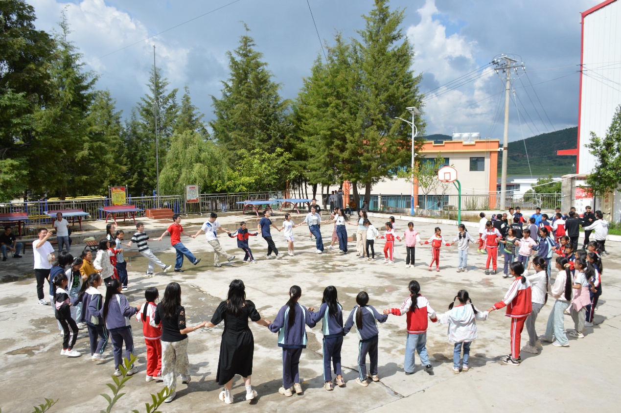 随后,我们走出教室,孩子们兴奋地牵着我们奔向操场,邀请我们一起跳起当地的民族舞蹈——“打跳”。鼓点般的节奏简单而热烈,孩子们拉着我们的手围成圈,脚步轻快有力,笑声此起彼伏。我们很快被他们的热情感染,仿佛不再是来访的客人,而是这片土地日常生活的一部分。